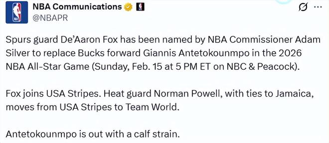 聯(lián)盟官方宣布,馬刺后衛(wèi)德阿隆-??怂?/span>被總裁亞當-蕭華選為替補人選,但他不會加入世界隊,而是代表美國條紋隊出戰(zhàn);熱火球員諾曼-鮑威爾將被調整至世界隊,他與牙買加有淵源。